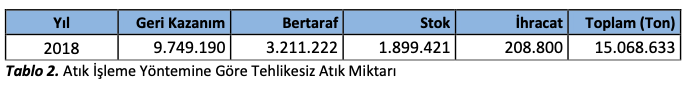 2018 yılında geri kazanım amacıyla atık işleme tesislerine gönderilen atık miktarı 9.749.190 ton, bertaraf edilmek üzere atık işleme tesisine gönderilen atık miktarı ise 3.211.222 ton olarak gerçekleşmiştir. Yılsonu itibariyle tesiste stok olarak tutulan tehlikesiz atık miktarı 1.899.421 ton, ihraç edilen tehlikesiz atık miktarı ise 208.800 ton olarak gerçekleşmiştir.