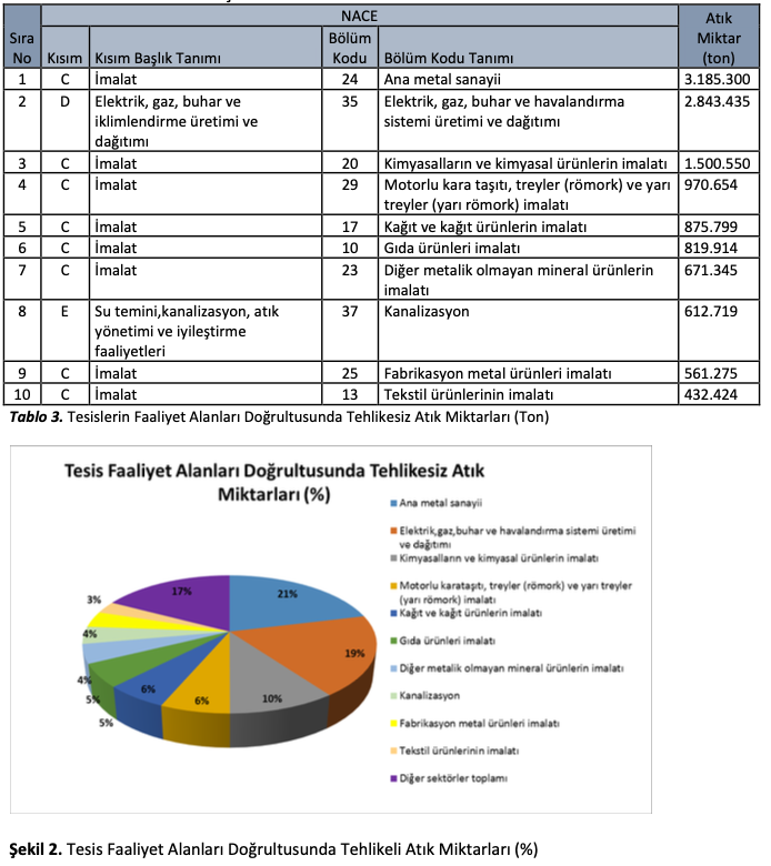 TABS’a yapılan beyanlar doğrultusunda en çok tehlikesiz atık oluşturan 10 sektör ve toplam tehlikesiz atık miktarları aşağıdaki tabloda verilmektedir. Sektör bilgisi için NACE Rev.2 altılı ekonomik faaliyet sınıflaması kullanılmıştır. 2018 yılında 81 adet NACE bölüm kodunda faaliyet gösteren tesisler beyan gerçekleştirilmiştir. En yüksek atık oluşumunun 3.185.300 ton ile imalat sektörü/Ana metal sanayii bölümünde yer alan tesislere ait olduğu görülmektedir. En yüksek tehlikesiz atık oluştuğu beyan edilen 10 faaliyet, toplam tehlikesiz atık miktarının %87’sini oluşturmaktadır.