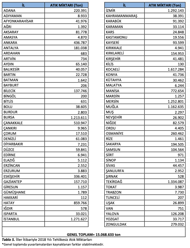 2018 yılı için Türkiye genelinde Tehlikesiz Atık Miktarı toplamı 15.068.633* ton olarak belirlenmiştir.